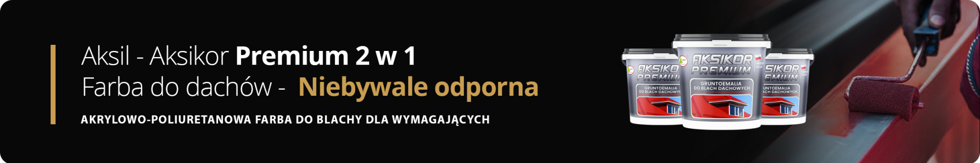 Aksil – Aksikor Premium 2w1 Wyjątkowa farba do dachów, łącząca cechy farby nawierzchniowej i gruntu. Stworzona z wodorozcieńczalnych żywic akrylowo-poliuretanowych, zapewnia ochronę antykorozyjną oraz dekoracyjny wygląd. Doskonała przyczepność do różnych rodzajów podłoży sprawia, że jest niezwykle uniwersalna. Oparta na nowoczesnych surowcach, gwarantuje najwyższą jakość wykończenia oraz trwałość.